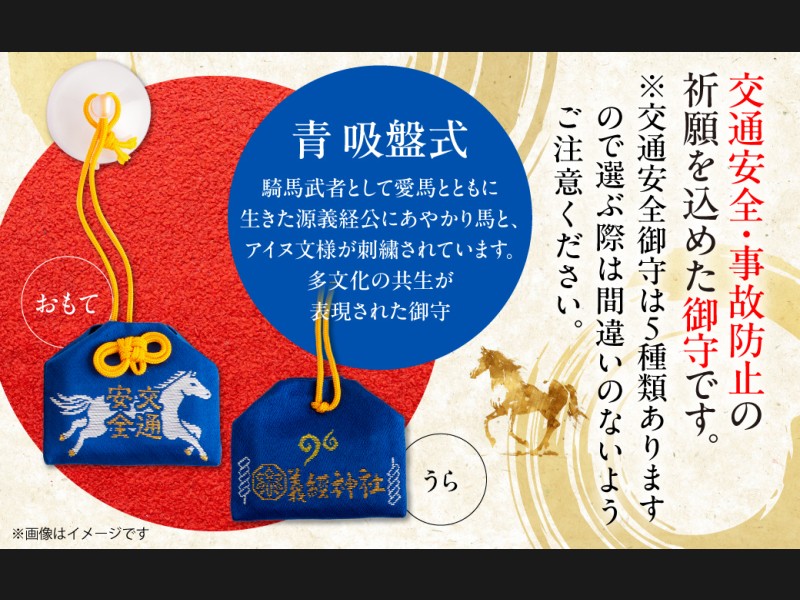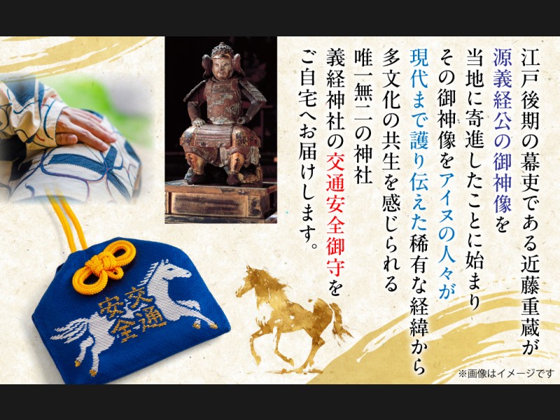江戸後期の幕吏である近藤重蔵が、源義経公の御神像を当地に寄進したことに始まり、その御神像をアイヌの人々が現代まで護り伝えた稀有な経緯から、多文化の共生を感じられる唯一無二の神社、義経神社の交通安全御守をご自宅へお届けします。