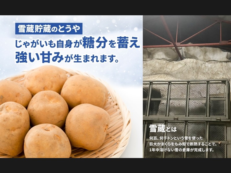 雪蔵貯蔵で糖度が上がり、甘みが詰まったじゃが芋に育ちます。