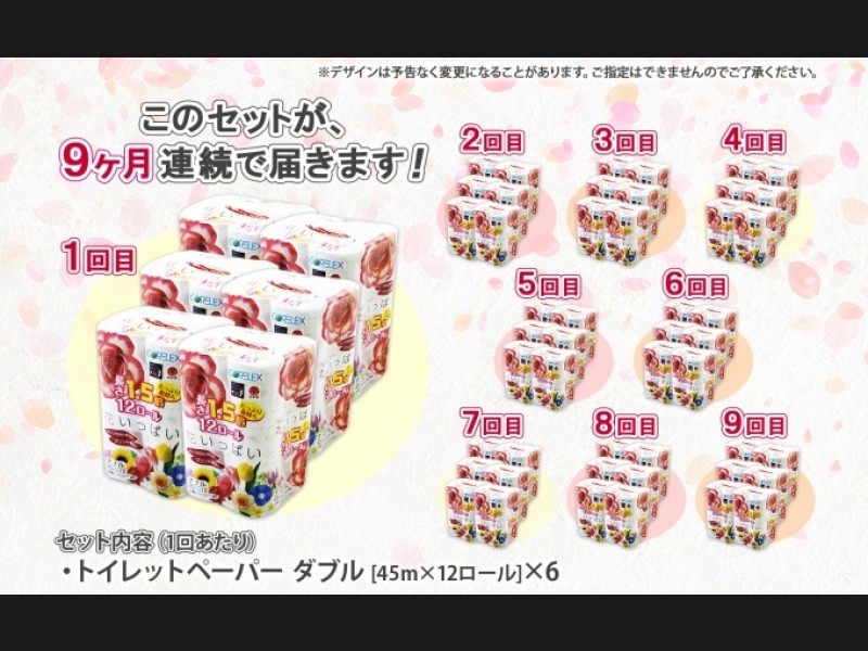 定期便 9ヵ月連続 全9回 長持ち 1.5倍巻き 花いっぱい トイレットペーパー ダブル 45m 計72ロール 全18...