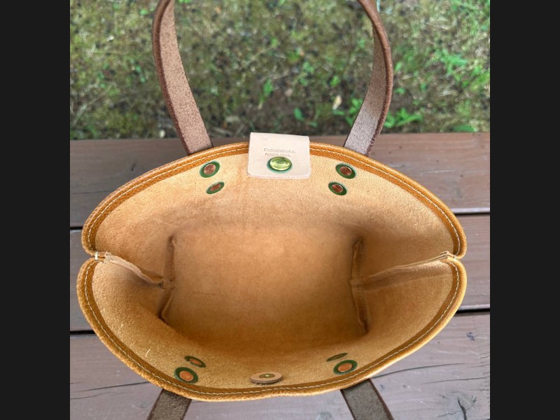 このバッグは、北海道紋別市・大山山頂園で、カフェと革工房のお店を夫婦二人で営んでいるお店で制作しています。
