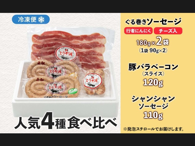 北海道 食べ比べ 4種セット ぐる巻き ソーセージ にんにく チーズ ベーコン シャンシャン ハム 北海道産...
