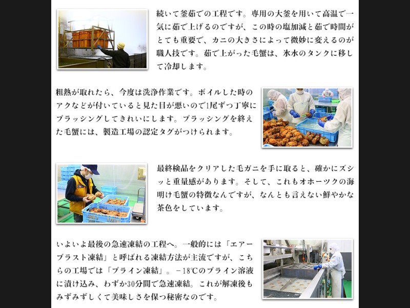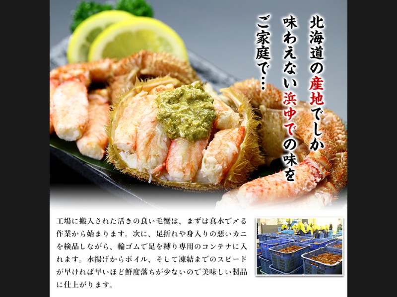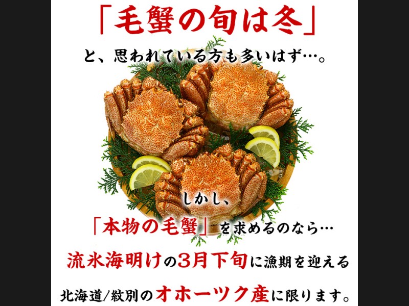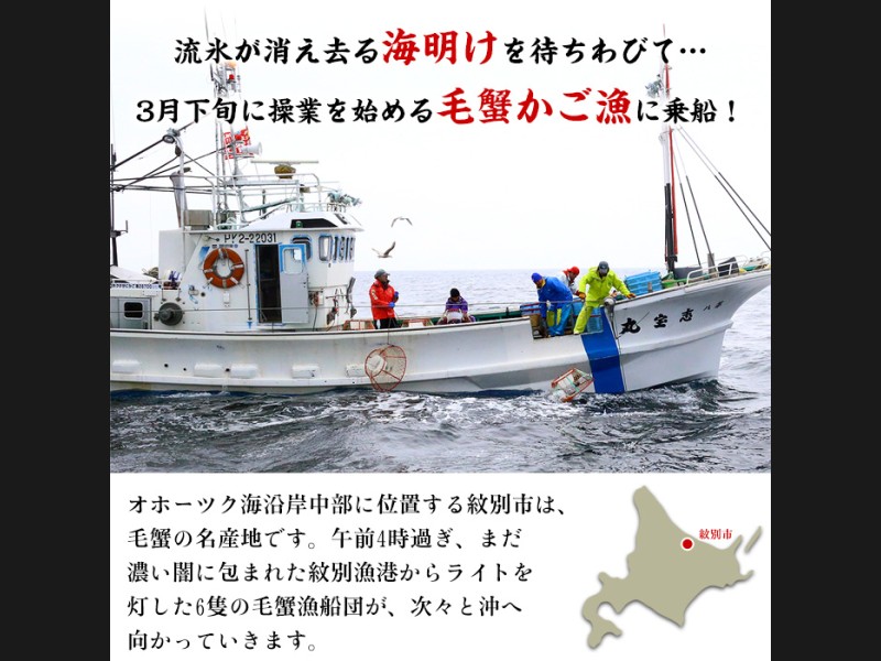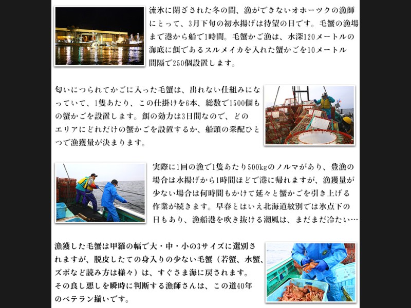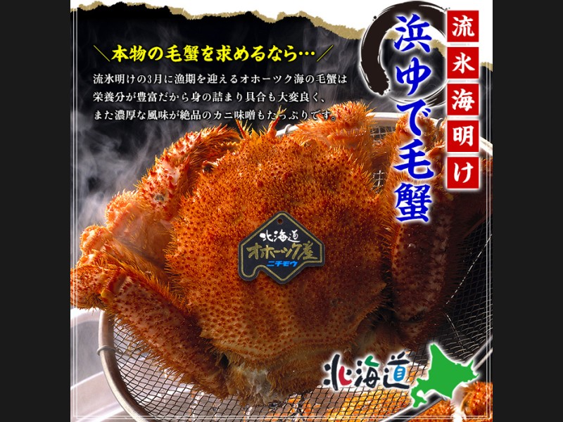 流氷がはぐくむ豊かな海で、毛ガニ・ズワイガニ・タラバガニの三大ガニのほか、ホタテ、鮭などの豊富な魚介類を味わえます。