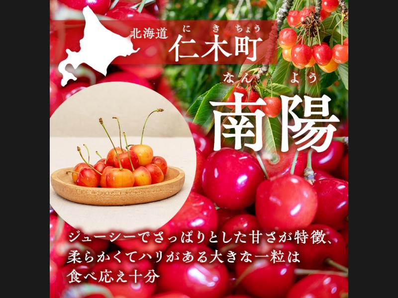 フルーツの生育にとって昼夜の寒暖差が丁度良い北海道仁木町で育てられる、ジューシーなさくらんぼ「南陽」。