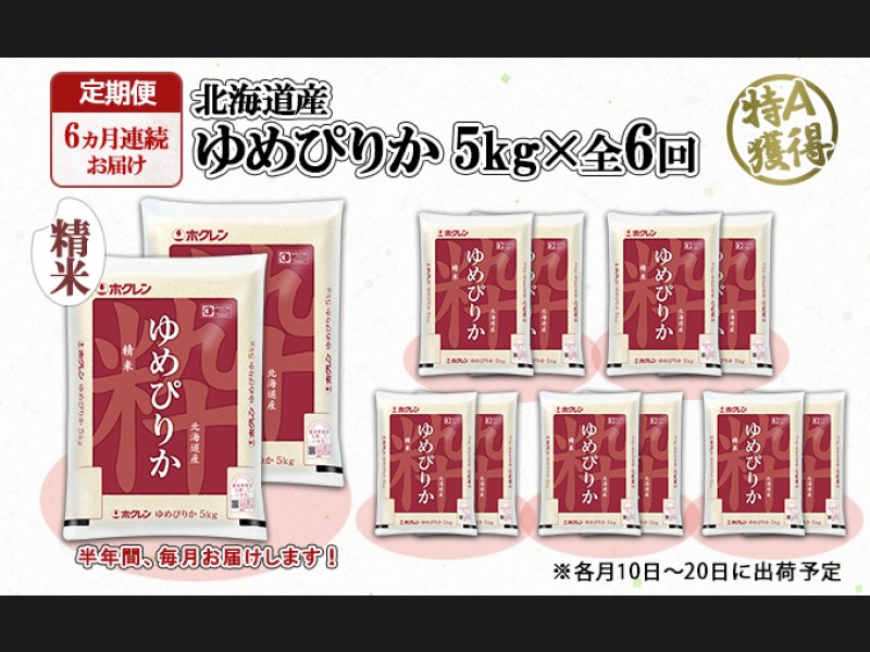 北海道の特A米『ゆめぴりか』精米 5kg×全6回の定期便です。