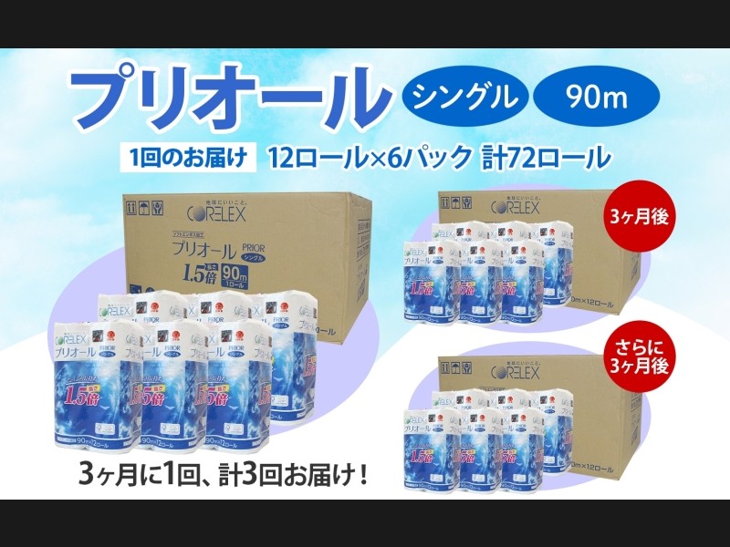 定期便 3ヵ月毎 全3回 プリオール・ピコ トイレット ペーパー 1.5倍巻き シングル 90m 12ロール 6パック...