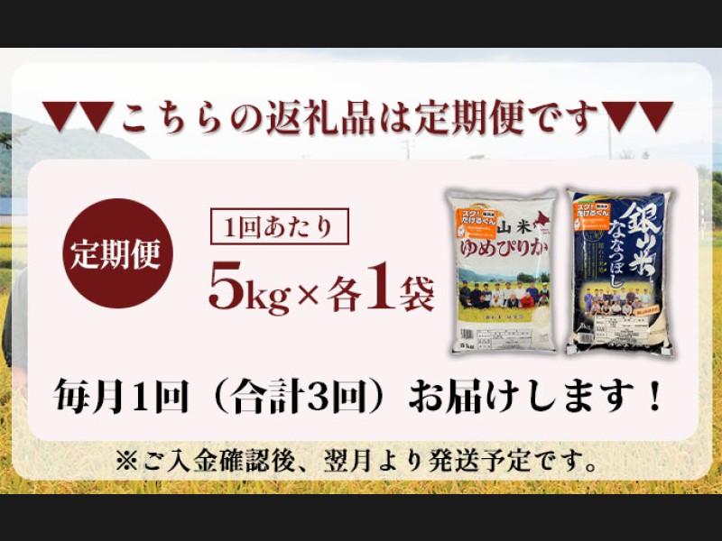 3ヵ月 定期便 銀山米研究会の無洗米<ゆめぴりか&ななつぼし>セット 計10kg(各1袋×5kgずつ)ライス ...