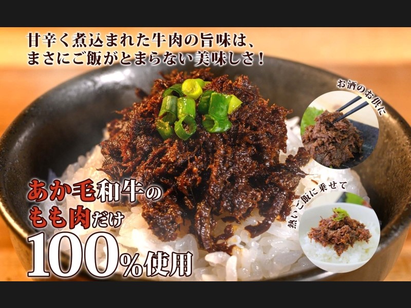 北海道洞爺湖町の大自然で育った今話題のあか毛和牛の「もも肉」だけを100%使用した佃煮です。もも肉をじっくり煮込んだ後、一晩かけて余分な脂を取り除き旨みとコラーゲンを生かし佃煮に仕上げました。 近隣のホテルやお土産屋などでも評判の逸品です!