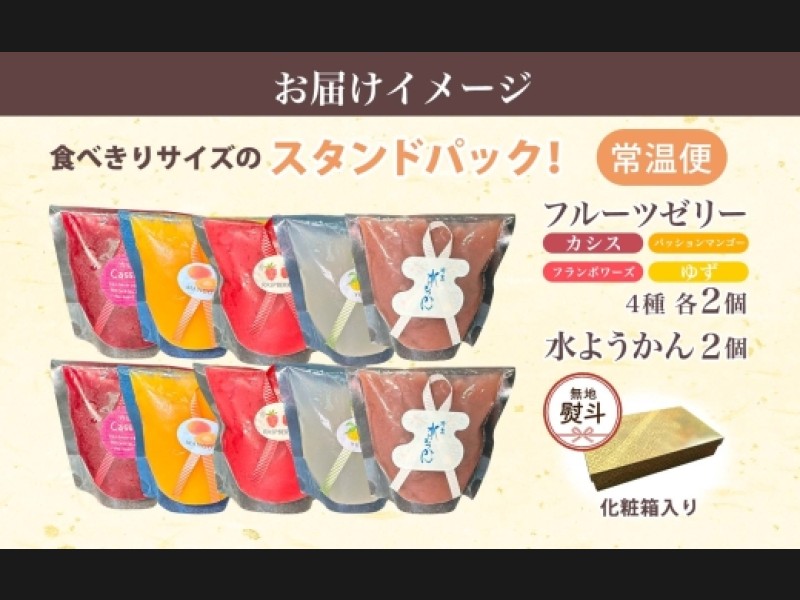 サイズ: 5種各2個(フルーツゼリー4種+水ようかん)化粧箱入り