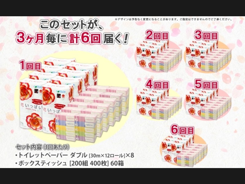 花いっぱい トイレットペーパー(ダブル)計96ロール&ボックスティッシュ 計60箱×全6回のお届けです。