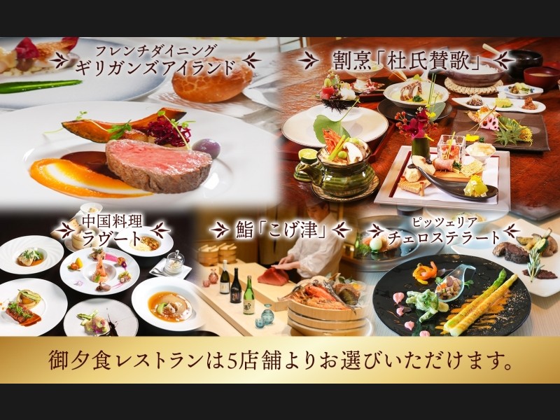 ※ご夕食レストランは、フレンチダイニング「ギリガンズアイランド」、割烹「杜氏賛歌」、中国料理「ラヴート」、鮨「こげ津」、ピッツェリア「チェロステラート」の5店舗よりお選び頂けます。レストランのご予約状況によりご希望に添えない場合もございますので、早めのご予約をお勧めいたします。ご朝食は、スパークリングワイン付の洋食と地元の食材を使ったこだわりの和定食よりお選びいただけます。また、食物アレルギーがございましたら事前にお申しつけ下さいますようお願い申し上げます。その他、食事の内容等につきましても事前予約時にご確認下さいますようお願い申し上げます。