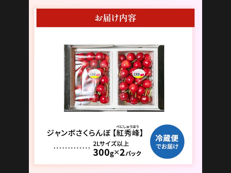先行受付 北海道 仁木町産 ジャンボサイズ さくらんぼ 【 紅秀峰 】2Lサイズ以上 300g×2パック 計600g ...