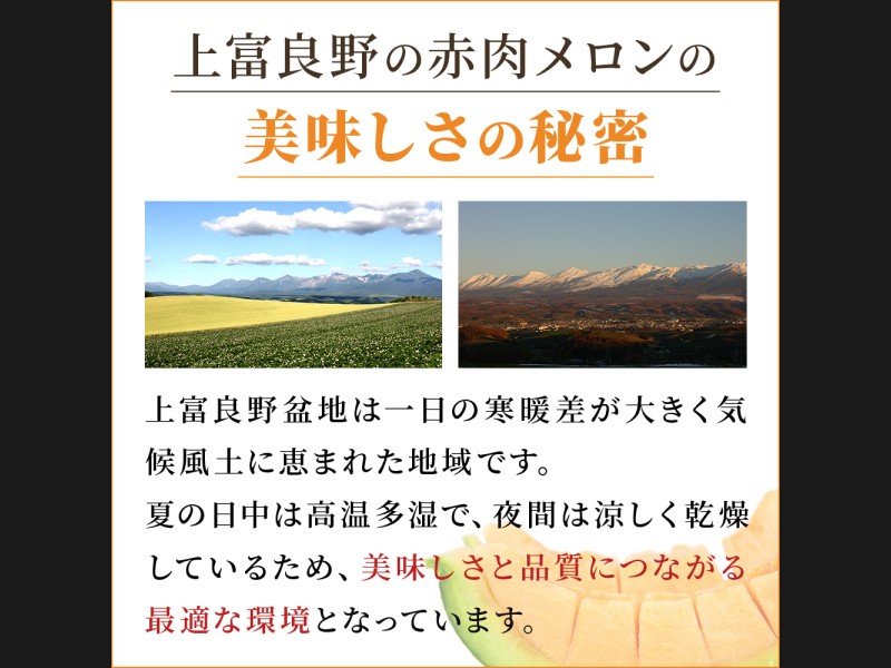 富良野盆地特有の、昼夜の大きな寒暖差を活かして育てた自慢の赤肉メロンです。