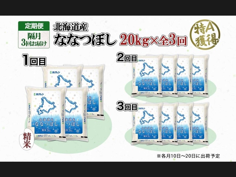 定期便 隔月3回 北海道産 ななつぼし 精米 20kg 5kg×4袋 米 特A 白米 お取り寄せ ごはん 道産米 ブラン...