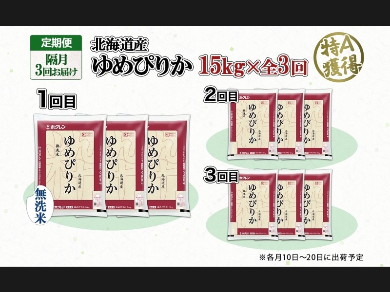 北海道の特A米『ゆめぴりか』無洗米 15kg(5kg×3袋)×全3回をお届けします。