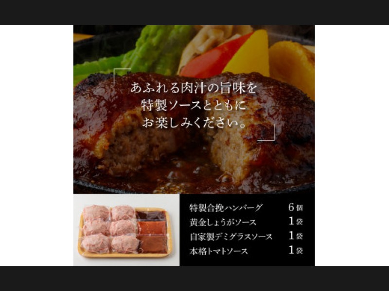 サイズ: 非加熱ハンバーグ130g×6ケ、自家製黄金しょうがソース・デミソース・トマトソース×各1ケ