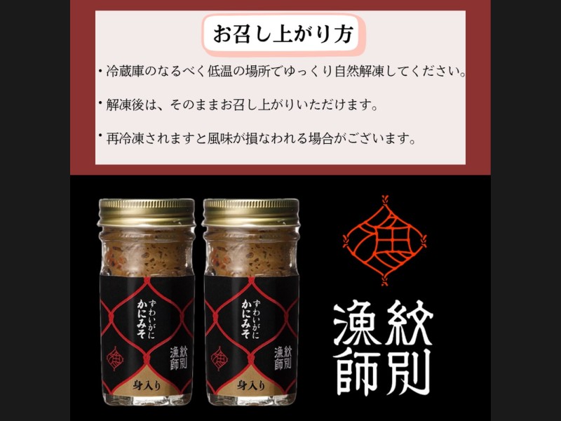 塩茹でしたずわいがにを素早く処理し、生のみそを1時間かけてゆっくり煮込み24時間低温熟成しました。塩・調味料は一切使用せず、かにみそ本来の塩分で仕上げております。※添加物や保存料を使用しておりませんので開栓後は概ね3日以内でお召し上がりください。