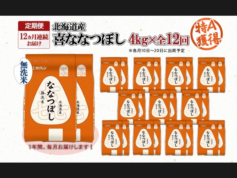 定期便 12ヵ月連続12回 北海道産 喜ななつぼし 無洗米 4kg 米 特A 白米 ななつぼし ごはん ブランド米 4...