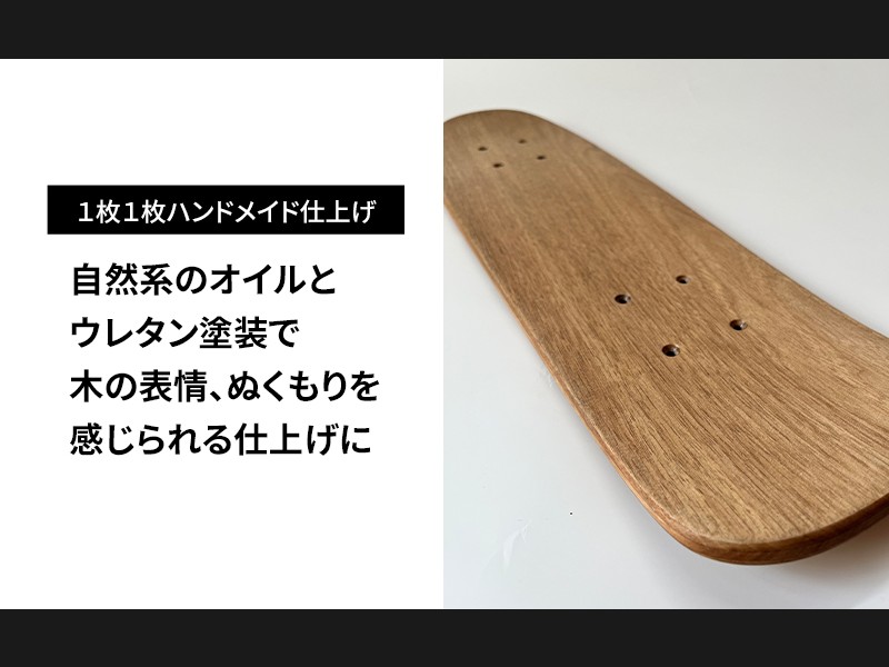 一枚一枚、ハンドメイドで丁寧に仕上げており、自然系のオイルとウレタン塗装を使い分けることで、木の表情と乗り心地の両立を実現しました。