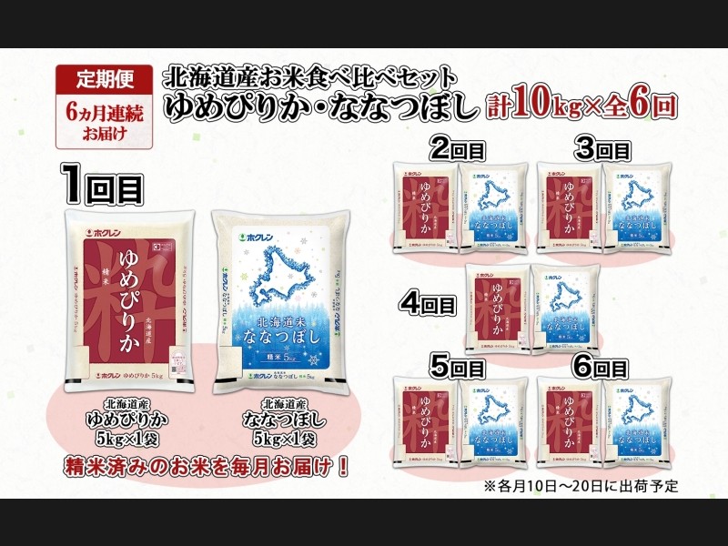 定期便 6ヵ月連続6回 北海道産 ゆめぴりか ななつぼし 食べ比べ セット 精米 5kg 各1袋 計10kg 米 特A ...