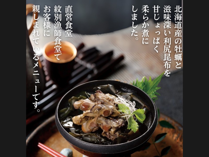 北海道沖で水揚げされた新鮮な牡蠣を厳選。たっぷりの利尻昆布と一緒に甘じょっぱく煮つけました。漁師町ならではのシンプルな味付けは飽きの来ない、親しみやすいおいしさです。