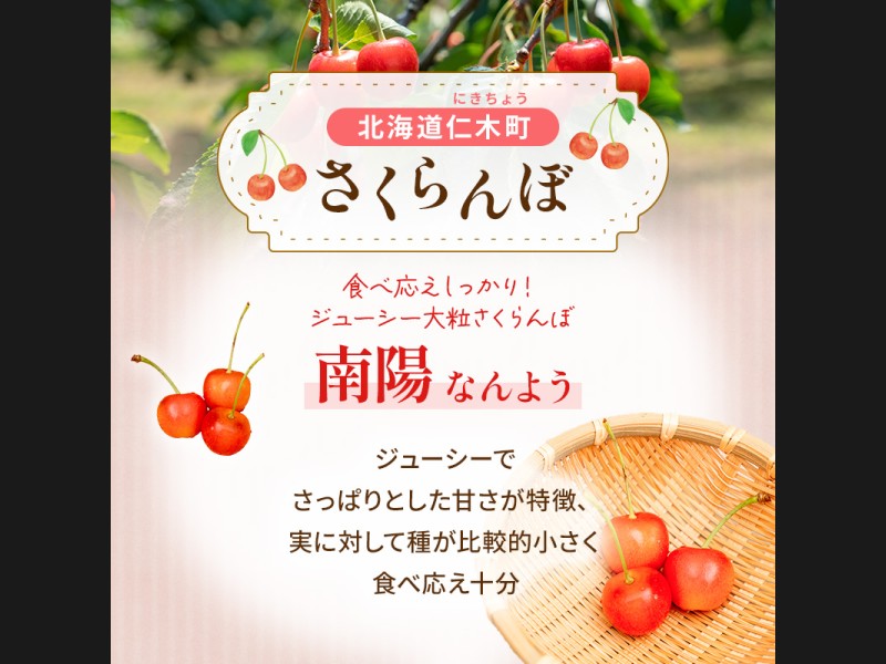 北海道仁木町の寒暖差の大きな気候からうまれる、ジューシーなさくらんぼ「南陽」。