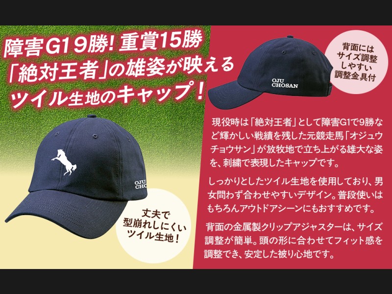 障害レース界の絶対王者「オジュウチョウサン」の放牧地で立つ雄大な姿が刺繍されたキャップです。