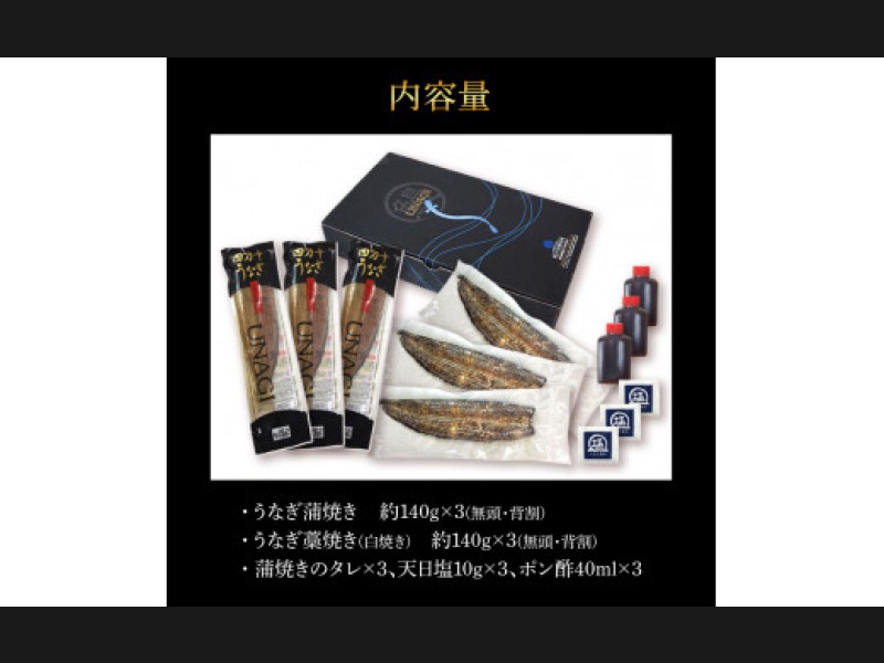 サイズ: ・うなぎ蒲焼き 約140g×3(無頭・背割)、うなぎ藁焼き(白焼) 約140g×3(無頭・背割)、