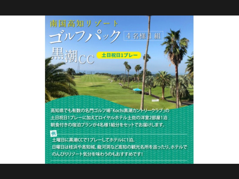 高知県でも有数の名門ゴルフ場 Kochi 黒潮カントリークラブ「土日祝日1プレー」と、Royal Hotel 土佐の1泊朝食付きの宿泊プラン4名様分がセットになった商品です。
