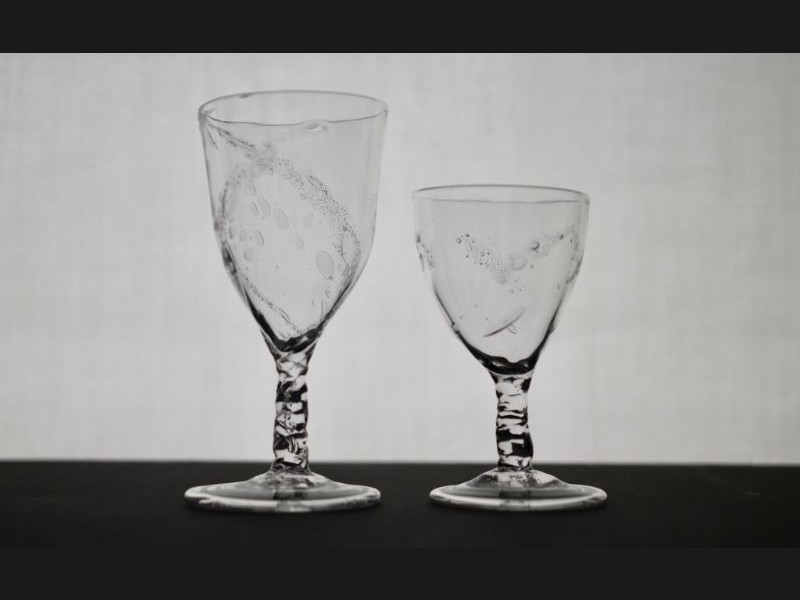 無色透明なガラスを宙吹きという技法を使い、一点ずつ型を使わずフリーハンドで制作しています。