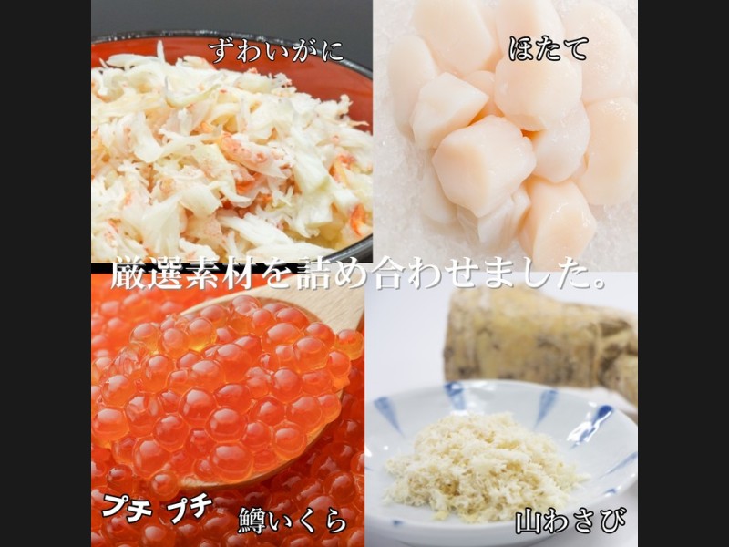 【原産地】ずわいがに、帆立:北海道沖産、いくら醤油漬け(鱒卵):アメリカ産又はロシア産