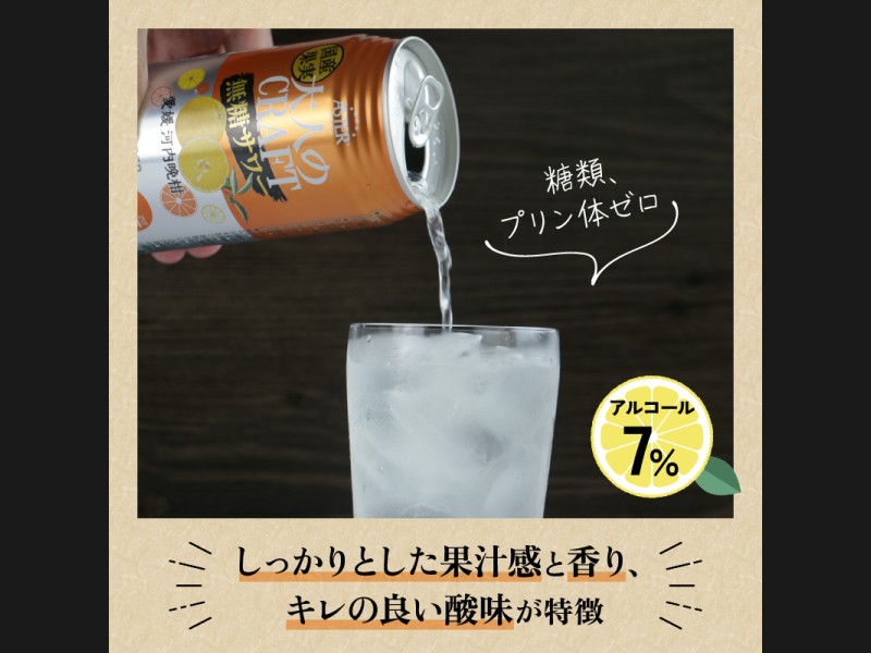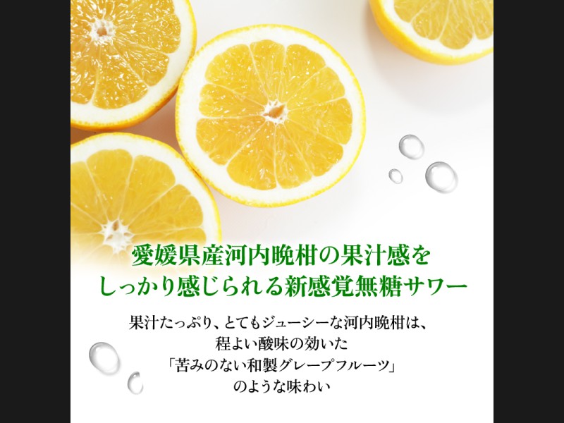 年齢とともに気になってくる糖類とプリン体はゼロ。食事中にピッタリなドライな味わいでありながら、愛媛県産河内晩柑のストレート果汁を使用し、豊かな果汁感も楽しめます。ビールやハイボールのような力強い風味、味わいが好きな方に特におすすめです。