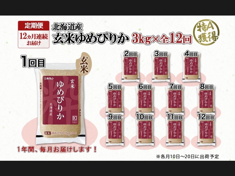 定期便 12ヵ月連続12回 北海道産 ゆめぴりか 玄米 3kg 米 特A 獲得 お取り寄せ ごはん 道産米 ブランド...