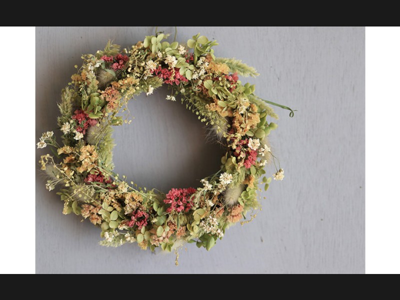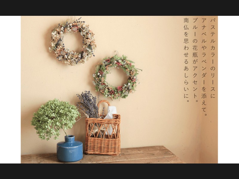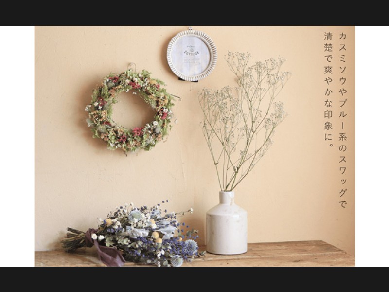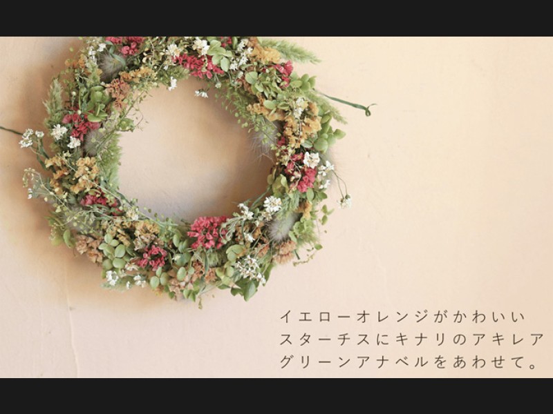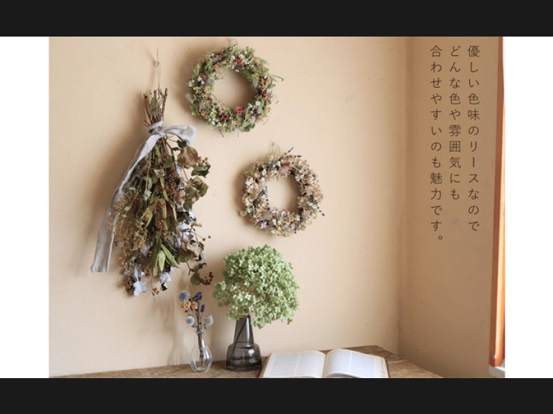 ピンクのリースやブルーやグリーン系のリースやドライフラワーと合わせると明るくかわいい印象に。