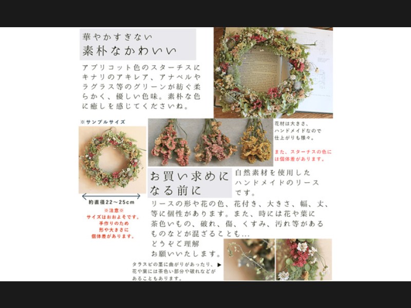 ※ドライフラワーは葉や花の付き方・葉や花の大きさ・枝ぶり・色・形・開き具合に個体差があります。また、多少色や形が悪いもの、黒ずみ・汚れ・虫のくった跡・やぶれ・潰れがあるものがまざります。ご了承ください。