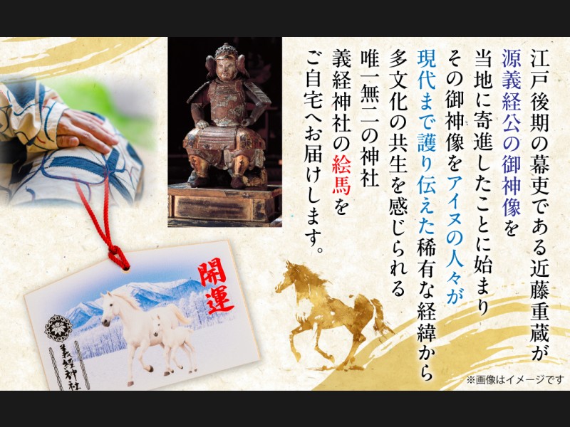 江戸後期の幕吏である近藤重蔵が、源義経公の御神像を当地に寄進したことに始まり、その御神像をアイヌの人々が現代まで護り伝えた稀有な経緯から、多文化の共生を感じられる唯一無二の神社、義経神社の絵馬をご自宅へお届けします。