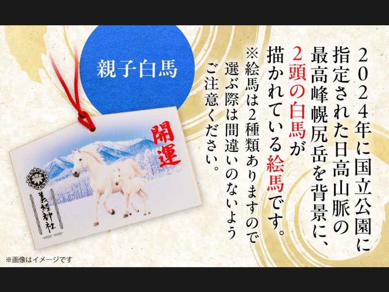 2024年に国立公園に指定された日高山脈の最高峰幌尻岳を背景に、2頭の白馬が描かれている絵馬です。