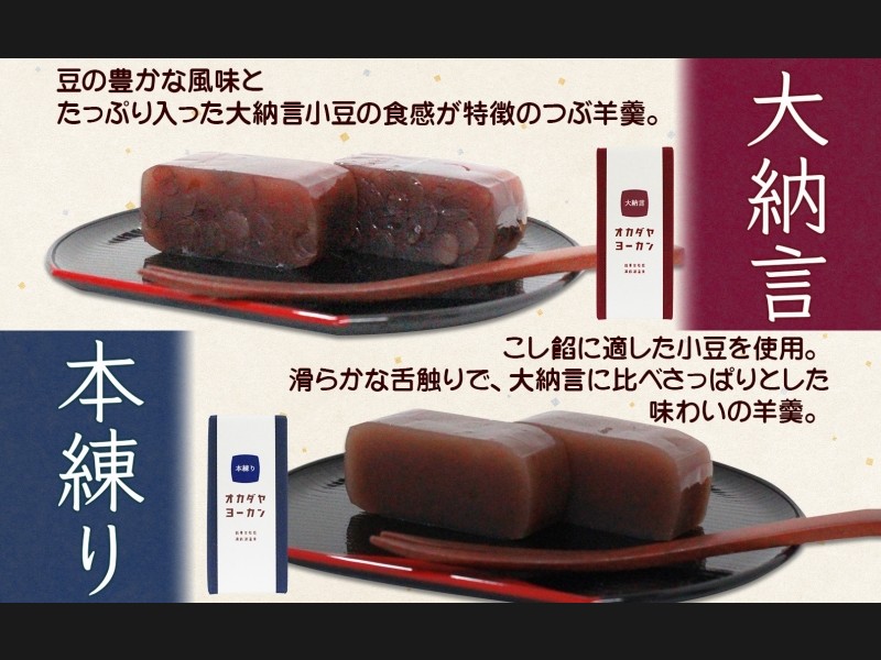 豆の豊かな風味と、たっぷり入った大納言小豆のつぶつぶとした食感がおいしい羊羹です。