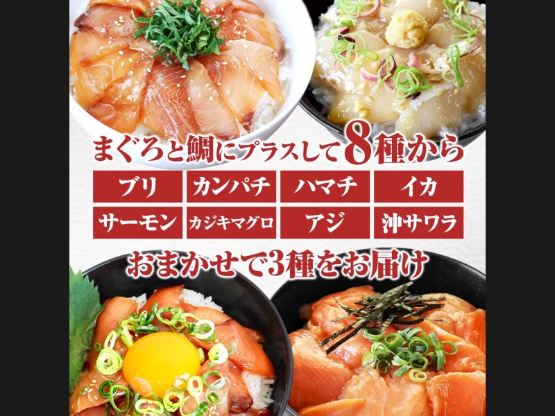 マグロと鯛の他は、ブリ・カンパチ・ハマチ・イカ・サーモン・カジキマグロ・アジ・沖サワラからランダムで3種を選んでお届けします。