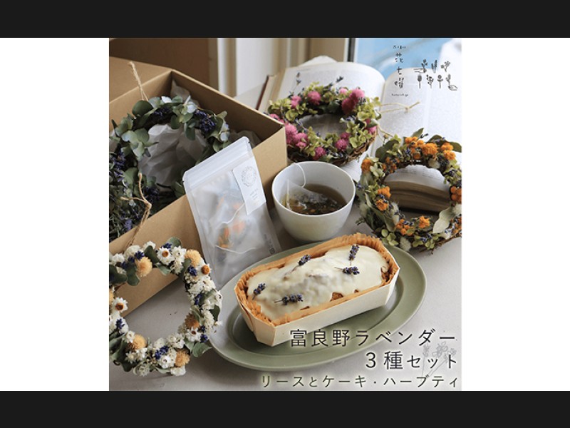富良野花七曜がお届けする、富良野産ラベンダーがたっぷり楽しめるリースとケーキ・ハーブティの3点セットです。 箱を開けると富良野の...