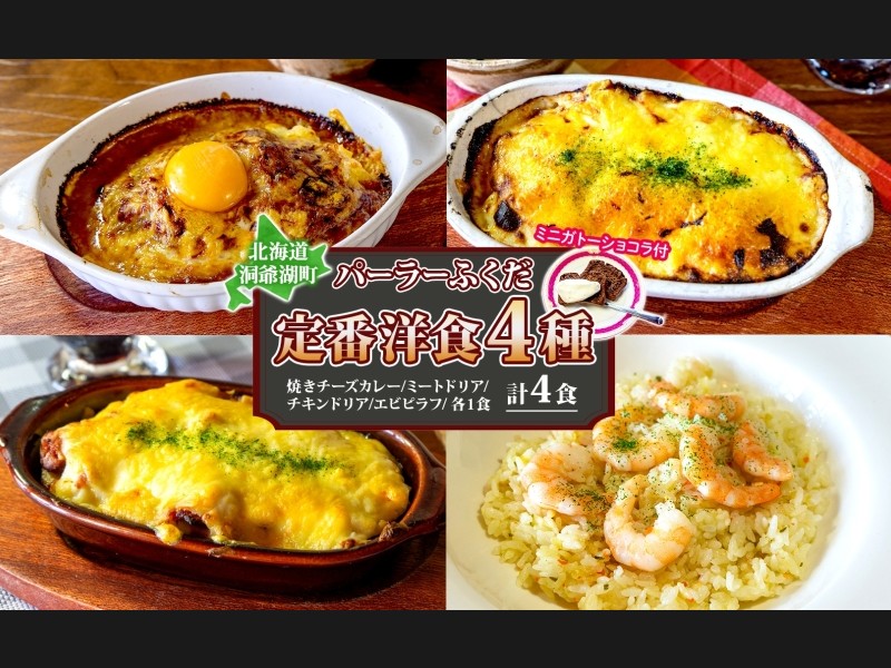 洞爺湖温泉街で大人気の手作り洋食! 素材にもこだわった洋食4種の食べ比べセットをお届けします。 パーラーふくだ特製の手作り洋食4種...