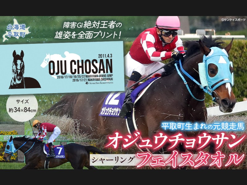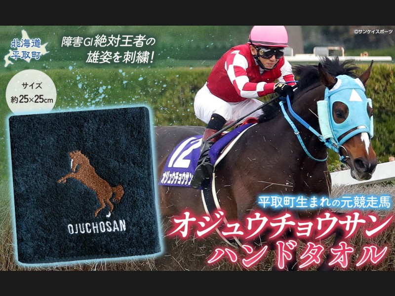 【返礼品の説明】 障害レース界の絶対王者「オジュウチョウサン」が大きく刺繍されたハンドタオルです。 吸水性にも優れ、普段使いか...