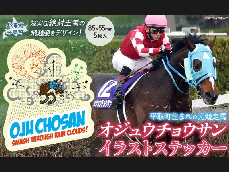 【返礼品の説明】 障害レース界の絶対王者「オジュウチョウサン」が豪快に飛越する姿を可愛くデザインしたステッカーです。 5枚入り...