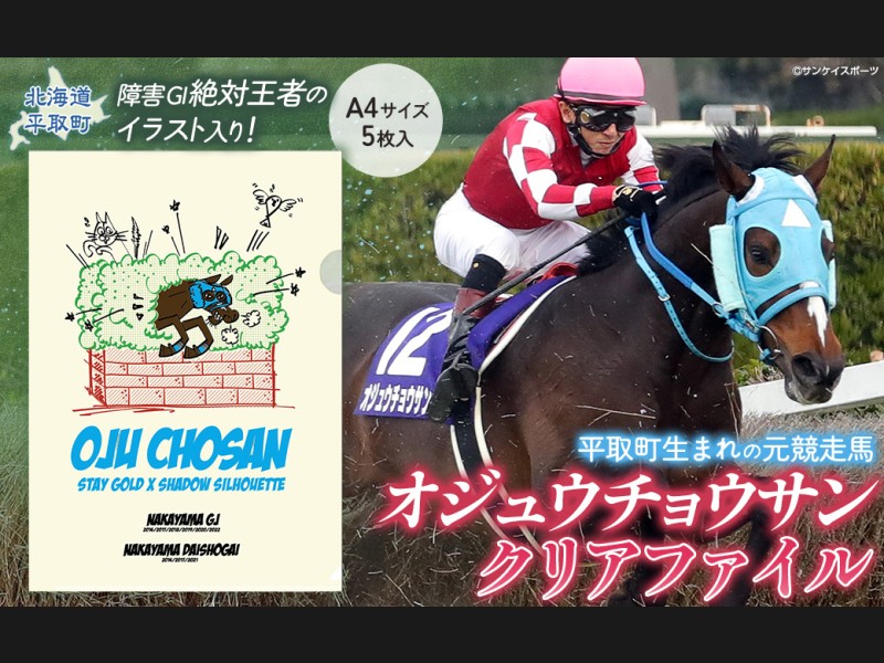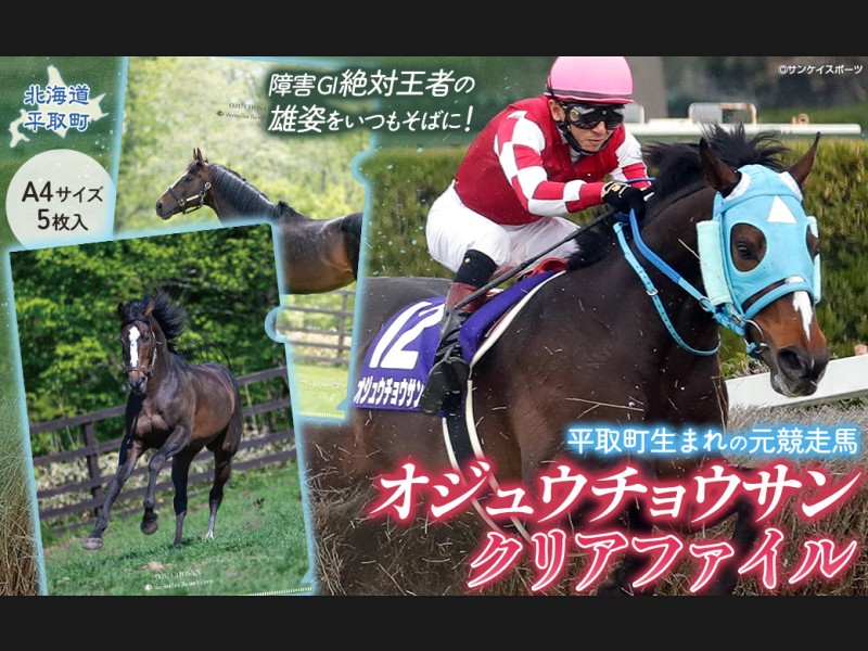【返礼品の説明】 障害レース界の絶対王者「オジュウチョウサン」を可愛くイメージしたクリアファイルです。 5枚入りなので、是非、...