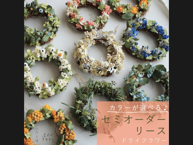 お好きなカラーを選ぶだけで花七曜らしい素朴なデザインのミニリースが届くドライフラワーセミオーダーリースが登場です。 ドライフ...