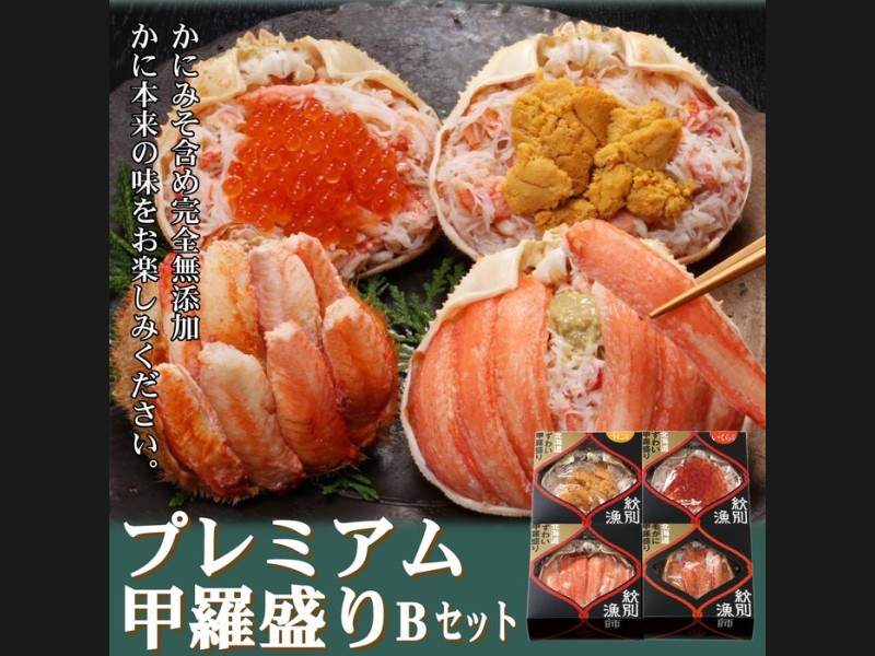 紋別沖産の毛がに、ずわいがにを使用したプレミアム甲羅盛りに「むしうに」や「いくら醤油漬」がのったとっても贅沢なセットです。※いく...