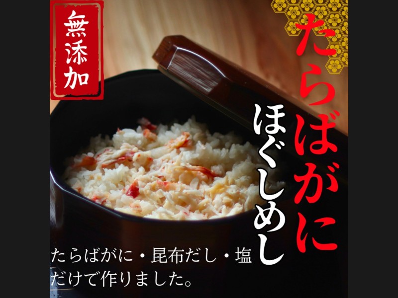 水揚げされたたらばがに。その身を手ほぐしし、炊き込みご飯の素にしました。 添加物は一切使用せず、たらばがに、利尻昆布だし、塩のみ...