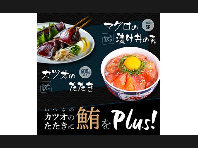 大きさ規格外のカツオのたたき600gに、マグロ漬け丼を5食分をプラスいたしました。 ロス無く食べきれるサイズでとっても地球にやさしい...
