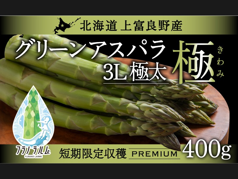 北海道・上富良野町産 グリーンアスパラガス「フラノラルム」3Lサイズ 400g(目安5~8本) 北海道上富良野町で育った、極太グリーン...
