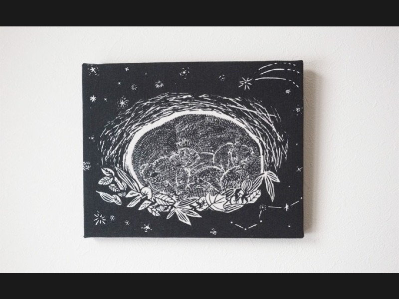 冬、あたたかい巣の中でいっしょに眠る熊の親子を染めました。 シルクスクリーンの手捺染で染めた生地をファブリックパネルに仕立て...
