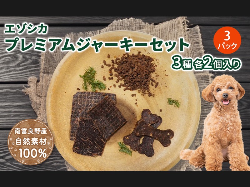 エゾシカ肉を使用した3種のプレミアムジャーキーセットです。 高級感溢れるパッケージはお友達にお裾分けや、愛犬の特別な日にプレゼン...